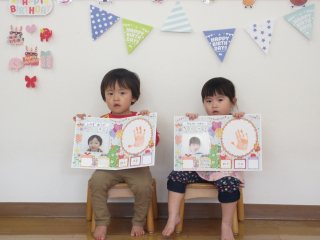 すみれ組は2人のお誕生日をお祝いしました!カードをもらうと嬉しそうな子どもたち。