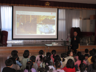 給食でお世話になっている米沢牛黄木さんから″うしの博士佐藤先生″をお招きしてスライドを通し牛の1日のお話をお聞きしました。
