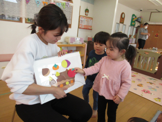 たんぽぽ組では、エプロンシアターで誕生日ケーキ作り♪果物やクリームをトッピングして、可愛いケーキの完成です!