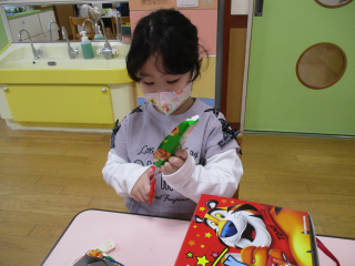 次はつると葉っぱ作り!つるをくねくねに切るためのハサミや手の動きに挑戦してみました。葉っぱを切っていると「折り紙は切りやすい」「やわらかい」「画用紙は硬い」と素材の触り心地の違いや硬さに気付き、発見した喜びを味わう子どもたち。