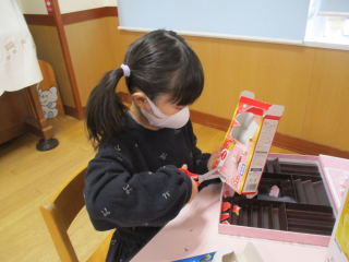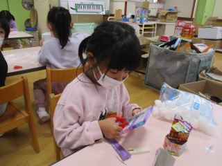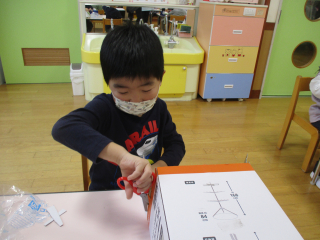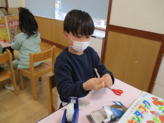 今日は年長組の造形教室!!段ボールやお菓子の空き箱、ラップの芯、ペットボトルのキャップなどの廃材を利用して自分たちの好きな物を作りました。まずは好きなお菓子の空き箱などを真剣に吟味して土台を決めました。