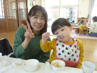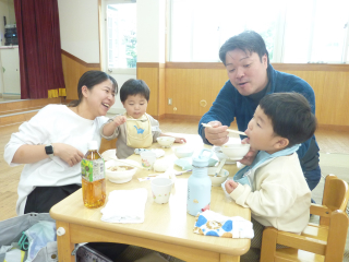 お家の方と一緒での園での昼食にいつも以上にパクパクでした。ご飯、芋煮3杯おかわりした子もいてビックリでした。