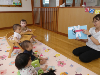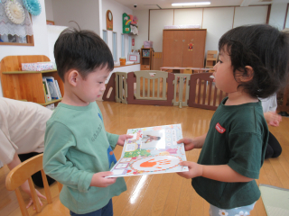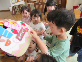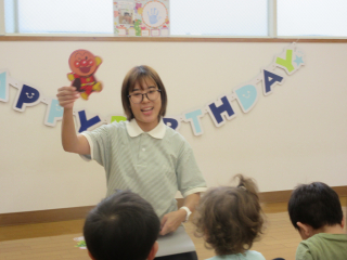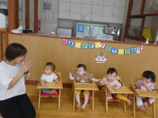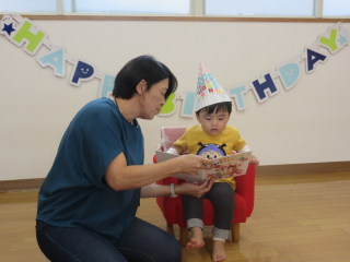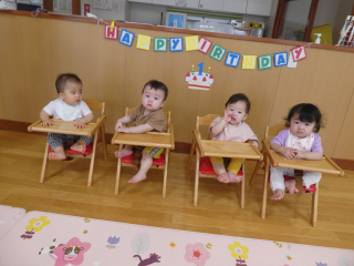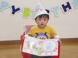 すみれ組は元気なお友だち☆ドキドキしながらもお誕生カードをもらえると微笑んでいました。