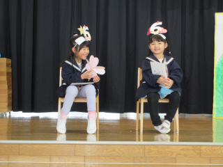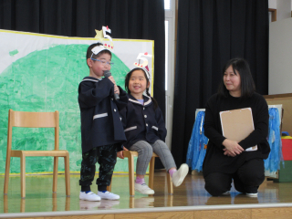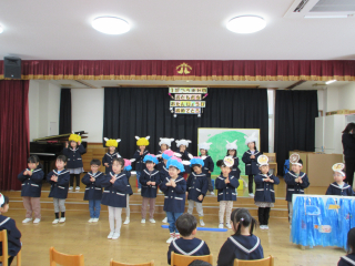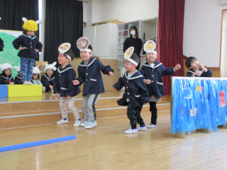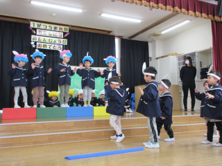 本日の出し物は4歳児さんが担当してくれ…12月のクリスマス発表会から劇あそびが楽しくなった子どもたちは「もう一度劇をやりたい!」と三匹のヤギのガラガラドンを披露してくれました。