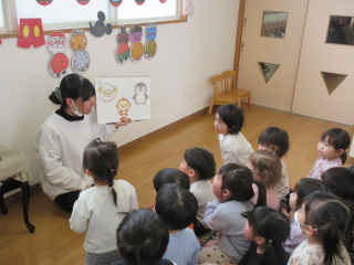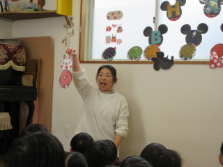 季節のうたや出し物の「だれのパンツ」のペープサート&「だれの声かな」のスケッチブックシアターを楽しみました♪