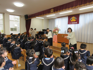園長あいさつ、職員紹介後の新入園児さん紹介では、かわいくお家の方とお返事してくれました☆