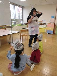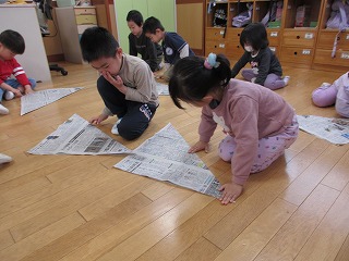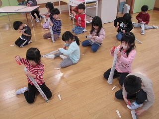 今年度、初めての造形教室。新聞紙を使って、兜を折ったり、くるくる丸めて先っぽにハサミで切込みを入れて、たいまつを作りました。説明を聞きながら楽しく作ることができたようです。最後に、折り紙を折って、切って可愛いお花を一人ひとりが作って、さくら組前の木に貼っています。「たのしかった」「もっとしたい」との声がありました。様々な技法を覚えながら楽しく今後も経験しながら造形教室を行いたいと思います。兜と、たいまつをお持ち帰りします。ぜひ見て下さいね。