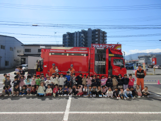 いつもは園舎前の道路をスーッと通り過ぎるのを見るだけの消防車を見ることができて、「かっこいい✨」と大喜びで記念写真までパシャリ📸