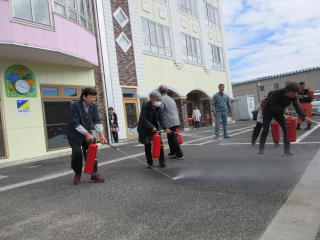 火災の発見から初期消火の仕方を佐藤防災の方から教えていただき、「火事だ!」と実際の状況を想定して訓練を行いました。