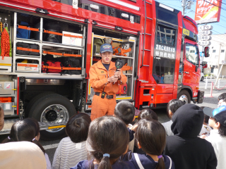 かっこいい消防車を目の前にしワクワクしていた子どもたち。近くに移動し、署員の方から装備品の紹介をしてもらいながらの見学がスタート!👀