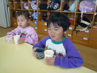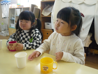 ミキサーの音にびっくり!!みかんやバナナの形が無くなり白い牛乳の色からオレンジ色に変化していく様子を観察しました。飲んでみると・・・おいしい~