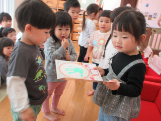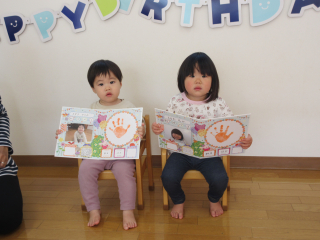 すみれ組は元気なお友だち☆ドキドキしながらもお誕生カードをもらえると微笑んでいました。